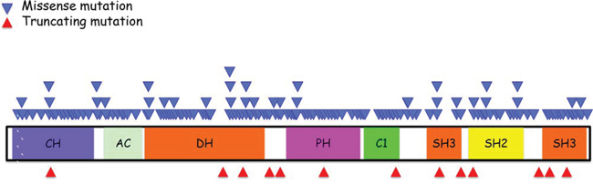 Figure 1: Schematic summary of Vav1 structure and location of various mutations identified in human cancers. Vav1 encodes the following domains: calponin-homology (CH) domain; acidic (AC) motif, which contains 3 tyrosine residues; a DBL homology (DH) domain; a pleckstrin homology (PH) domain; a C1 domain; two SRC-homology 3 (SH3) domains; and a SRC-homology 2 (SH2) domain. The function of each region is detailed in the text. The location of missense mutations (light blue triangles) is indicated above the protein stricture and the location of truncations (red triangles) are depicted beneath. The information concerning these mutations is adapted from the catalogue of Somatic Mutations in Cancer (COSMIC) database.