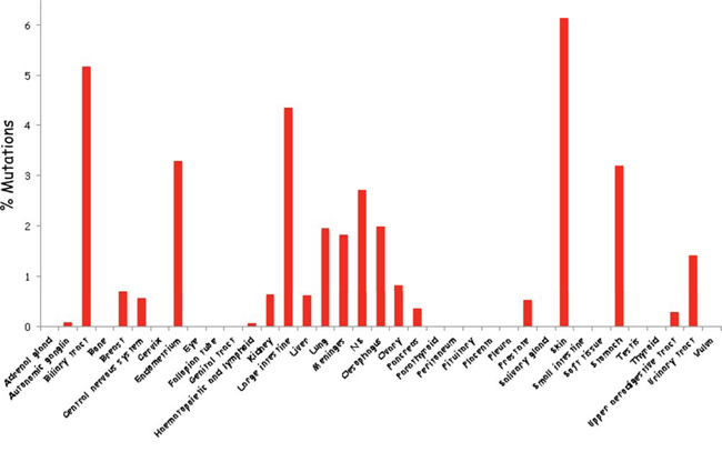 Figure 2: Schematic summary of Vav1 mutations in cancer of various tissue origins. The percentage of Vav1 mutations in numerous tissues was calculated according to the information available from the catalogue of Somatic Mutations in Cancer (COSMIC) database.