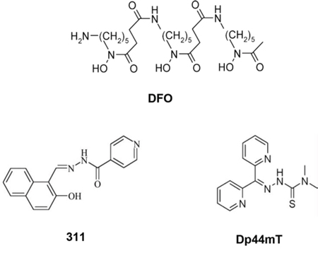 Figure 1: Line drawings of the structures of the chelators: DFO, 311 and Dp44mT.