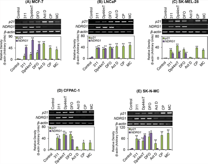 Figure 2: The effect of the chelators 311, Dp44mT, or DFO, and the DNA-damaging agents, Act D, CP or MC on p21 or NDRG1 mRNA levels in five different tumor cell lines. A. MCF-7; B. LNCaP; C. SK-MEL-28; D. CFPAC-1; and E. SK-N-MC cells. Cells were incubated for 24 h/37°C with the chelators, 311 (25 μM), Dp44mT (2.5 μM), DFO (250 μM), or the DNA-damaging agents, Act D (5 nM), CP (20 μM), or MC (30 μM). The gels are typical of 3 independent experiments, while the densitometric analysis is mean ± SD (3 experiments). Relative to control: *p < 0.05, **p < 0.01, ***p < 0.001.