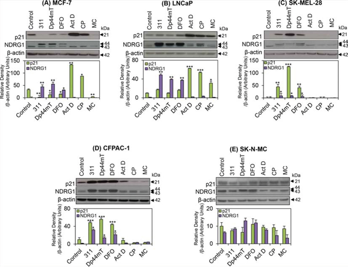 Figure 3: The effect of the chelators 311, Dp44mT, or DFO, and the DNA-damaging agents, Act D, CP or MC on p21 or NDRG1 protein levels in five different tumor cell lines. A. MCF-7; B. LNCaP; C. SK-MEL-28; D. CFPAC-1; and E. SK-N-MC cells. Cells were incubated for 24 h/37°C with the chelators, 311 (25 μM), Dp44mT (2.5 μM), DFO (250 μM), or the DNA-damaging agents, Act D (5 nM), CP (20 μM), or MC (30 μM). The blots are typical of 3–6 independent experiments, while the densitometric analysis is mean ± SD (3–6 experiments). Relative to control: *p < 0.05, **p < 0.01, ***p < 0.001.