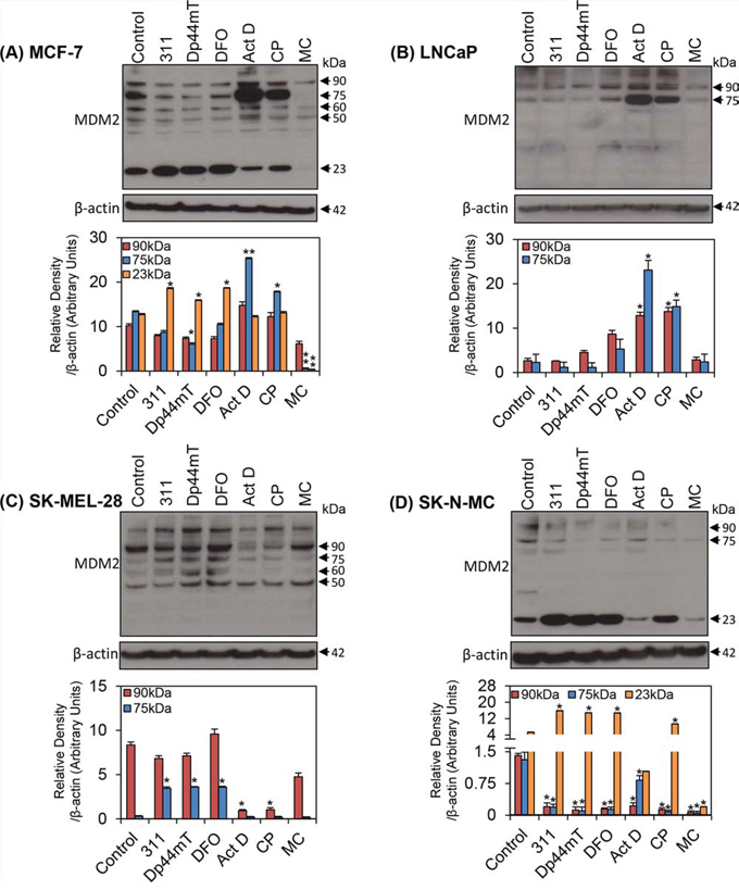 Figure 4: The effect of the chelators 311, Dp44mT, or DFO, and the DNA-damaging agents, Act D, CP or MC on MDM2 protein isoforms in four different tumor cell lines. A. MCF-7; B. LNCaP; C. SK-MEL-28; and D. SK-N-MC cells. Cells were incubated for 24 h/37°C with the chelators, 311 (25 μM), Dp44mT (2.5 μM), DFO (250 μM), or the DNA-damaging agents, Act D (5 nM), CP (20 μM), or MC (30 μM). The blots are typical of 3 independent experiments, while the densitometric analysis is mean ± SD (3 experiments). Relative to control: *p < 0.05, **p < 0.01, ***p < 0.001.