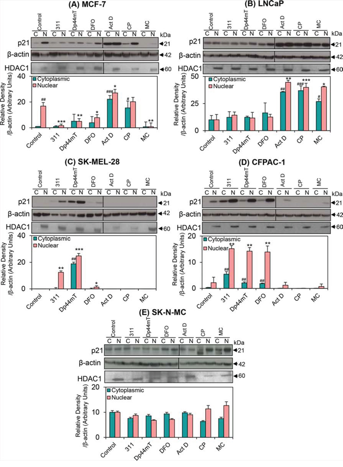Figure 5: The effect of the chelators 311, Dp44mT, or DFO, and the DNA-damaging agents, Act D, CP or MC on the cytoplasmic and nuclear expression of p21 in five different tumor cell lines. A. MCF-7; B. LNCaP; C. SK-MEL-28; D. CFPAC-1; and E. SK-N-MC cells. Cells were incubated for 24 h/37°C with the chelators, 311 (25 μM), Dp44mT (2.5 μM), DFO (250 μM), or the DNA-damaging agents, Act D (5 nM), CP (20 μM), or MC (30 μM). A vertical line appears on some blots to indicate the use of two gels. Indeed, in some experiments, due to hardware constraints, samples from one experiment were required to be run on 2 gels at the same time. These were then exposed equally under exactly the same conditions at the same time. The blots are typical of 3–6 independent experiments, while the densitometric analysis is mean ± SD (3–6 experiments). Relative to untreated control (cytoplasmic fraction): #p < 0.05, ##p < 0.01, ###p < 0.001. Relative to untreated control (nuclear fraction): *p < 0.05, **p < 0.01, ***p < 0.001.