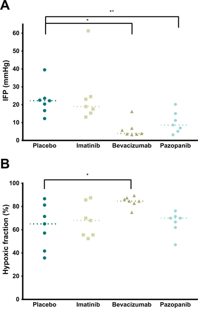 Figure 2: In vivo tumor measurements. A. Intratumoral IFP relative to atmosphere (p = 0.0008, single values, median). * Placebo vs. Bevacizumab (p = 0.0028). *° Placebo vs. Pazopanib (p = 0.0407). B. Tumor hypoxic fraction (% < 5 mmHg pO2; p = 0.0257, single values, median). * Placebo vs. Bevacizumab (p = 0.0279).