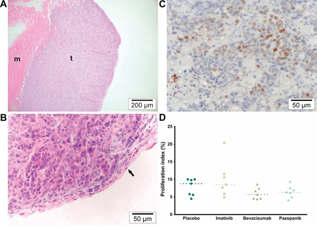 Figure 3: Microscopy overview and proliferation. A. H&E (100×). Overview of representative tumor section. Tumors were sectioned according to their orientation so that each section showed both the peritoneal and the muscular border. M indicates muscle and t tumor tissue. B. H&E (400×). Detail of tumor in which the mesothelium can still be identified along the peritoneal border (arrow). C. KI-67 (400×). Average hot spot of tumor cell proliferation. D. Proliferation index (% KI67+ nuclei; p = 0.1482, single values, median).