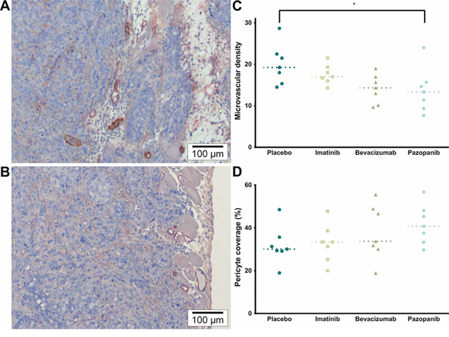 Figure 4: Tumor vascularity. A. α-SMA (brown) & CD105 (red) (200×). Representative image of MVD and Pericyte coverage of the Placebo and Imatinib groups. B. α-SMA & CD105 (200×). Representative image of the Bevacizumab and Pazopanib groups, mainly showing reduced vascularity. C. Microvascular density (CD105+ vessels; p = 0.0323, single values, median). * Placebo vs. Pazopanib (p = 0.0424). D. Pericyte coverage (% α-SMA+ vessels; p = 0.2446, single values, median).