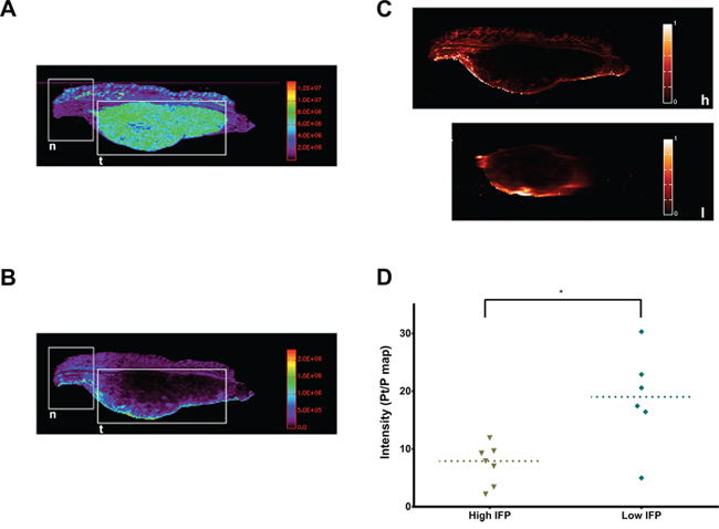 Figure 5: Tumor oxaliplatin distribution. A. LA-ICP-MS color map of tumor P distribution (n = normal tissue, t = tumor). B. LA-ICP-MS color map of tumor Pt (of Oxaliplatin) distribution (n = normal tissue, t = tumor). C. Pt/P maps of a tumor with high IFP (h) and one with low IFP (l). D. Average Pt/P intensity in the tumor peritoneal border region (p = 0.0221, single values, median).