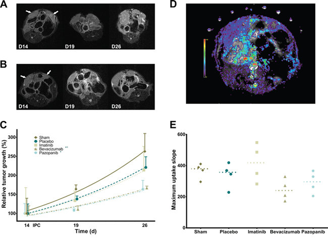 Figure 6: Tumor growth delay and vascularity. A. Serial MRI images of mouse abdomen with bilateral tumor nodules (Placebo) as indicated by arrows. B. Serial MRI images (Bevacizumab). C. Relative tumor growth delay after IPC (exponential growth curves; p = 0.0006, mean, standard deviation). * Sham vs. Pazopanib (p < 0.05). *° Sham, Placebo vs. Bevacizumab (p < 0.05). D. Color overlay image of DCE-MRI analysis of maximum uptake slope. E. Tumor maximum uptake slope (p = 0.0890, single values, median).
