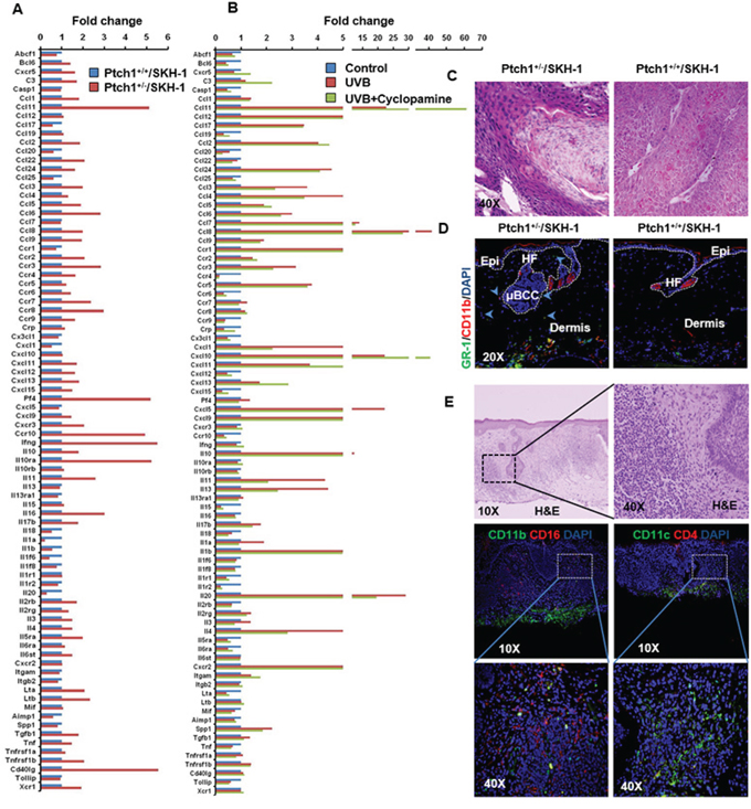 Figure 2: Inflammatory responses are augmented in the skin of Ptch1+/−/SKH-1 mice as compared to Ptch1+/+/SKH-1 mice and treatment with the SMO inhibitor cyclopamine attenuates these inflammatory responses. A. Bar diagram showing levels of relative gene expression of inflammatory cytokines/chemokines and their receptors in Ptch1+/+/SKH-1 and Ptch1+/−/SKH-1 mice. B. Bar diagram showing reduction of UVB-induced inflammatory response by cyclopamine in Ptch1+/−/SKH-1 mice. C. Comparison of pro-inflammatory tumor microenvironment in identical SCCs-like lesions excised from the skin of chronically UVB-irradiated Ptch1+/−/SKH-1 and Ptch1+/+/SKH-1 mice (original magnification 40X). D. Immunofluorescence staining showing presence of GR-1 (green)/CD11b (red)-positive myeloid cells around microscopic BCC-associated tumor stroma of age-matched control of Ptch1+/−/SKH-1 and skin of Ptch1+/+/SKH-1 mice. HF, hair follicle; Epi, epidermis; μBCC, microscopic BCC (original magnification 20X). E. H&E and immunofluorescence staining of the skin of patients with NBCCS showing presence of pro-inflammatory hematopoietic cells. Shown here are CD11b(green)/CD16(red)-positive and CD11c(green)/CD4(red)-positive cells in tumor stroma.