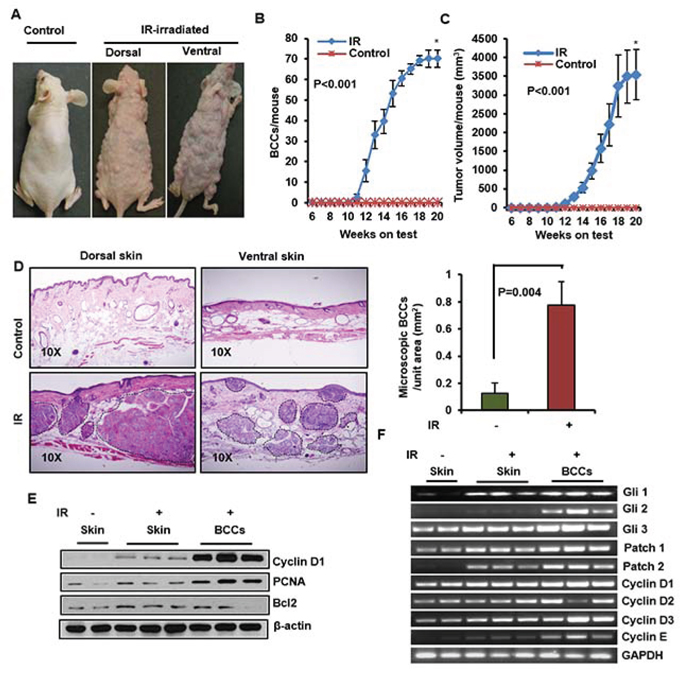 Figure 3: Ionizing radiation (IR) induce multiple BCCs in Ptch1+/−/SKH-1 mice. A. Representative pictures of Ptch+/−/ SKH-1 mice showing IR-induced visible BCCs on dorsal and ventral skin. B. BCCs/mouse. C. tumor volume/mouse; D. Histology of BCCs from dorsal and ventral skin, and analysis of microscopic BCCs/unit area (mm2) in IR-irradiated mice. E. Immunoblot analysis of biomarkers predictive of cell proliferation (PCNA and cyclin D1) and anti-apoptotic protein Bcl2 in BCCs of IR-irradiated mice. F. transcriptional expression of Glis, Ptchs and cell cycle regulatory cyclins in IR-irradiated BCC. Ptch+/−/SKH-1 mice were irradiated with a single dose (5Gy) of IR. The experiment was terminated at week 20 following irradiation. Skin and tumors were excised for histological and for molecular analysis.