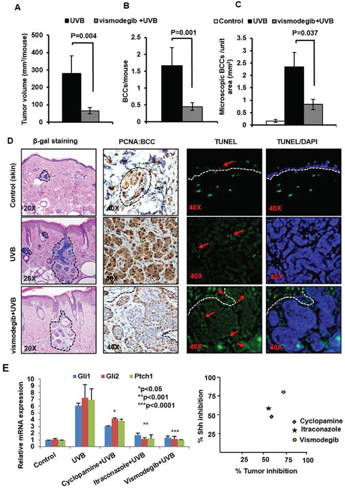 Figure 4: The SMO inhibitor Vismodegib partially attenuates UVB-induced BCC development in Ptch1+/−/SKH-1 mice. Ptch1+/−/SKH-1 mice were treated with orally administered vismodegib (40 mg/kg body weight twice weekly), 30 min prior to UVB irradiation (180 mJ/cm2). Tumor data were recorded each week. Data showing A. tumor volume/mouse (mm3). B. BCCs/mouse. C. microscopic BCCs/unit area of skin (mm2) of vismodegib- and vehicle-treated in UVB-irradiated Ptch1+/−/SKH-1 mice. D. β-gal staining of UVB-induced microscopic BCCs (magnification 20x), proliferative biomarker (PCNA) (magnification 40x) and TUNEL staining (magnification 40x) in BCCs from vismodegib- and vehicle-treated mice and E. relative ability of vismodegib, ITRA and cyclopamine to inhibit UVB-induced Shh signaling in Ptch1+/−/SKH-1 mice and its correlation with BCC growth inhibition.