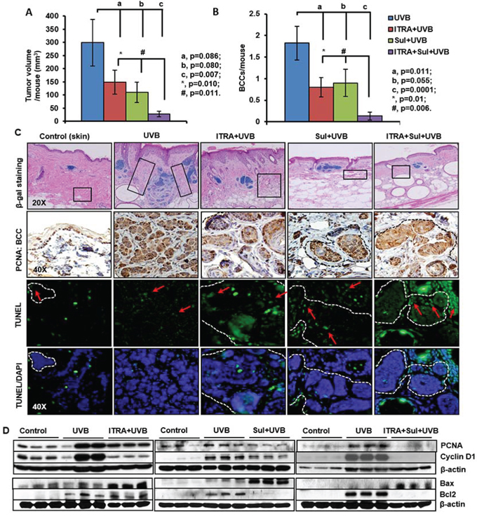 Figure 5: The NSAID Sulindac (Sul) potentiates SMO inhibitor, itraconazole (ITRA)-mediated inhibition of UVB-induced growth of BCCs in Ptch1+/−/SKH-1 mice. Ptch1+/−/SKH-1 mice were treated with orally administered ITRA (40 mg/kg body weight; twice weekly) and topically applied Sul (80 mg/kg body weight; twice weekly) alone and in combination, 30 min prior to UVB irradiation (180 mJ/cm2) for 30 weeks. Data showing A. tumor volume/mouse (mm3). B. BCCs/mouse from ITRA- and Sul-treated, alone and in combination and vehicle-treated animals C. β-gal staining (magnification 20x), proliferation biomarker (PCNA) (magnification 40x) and TUNEL staining (magnification 40x) of BCCs in ITRA- and Sul-, alone and in combination- and vehicle-treated UVB-irradiated mice. D. Western blot analysis showing expression of PCNA, cyclin D1, Bax and Bcl2 in the skin of ITRA and Sul alone and in combination of UVB-irradiated Ptch+/-/SKH-1 mice. Boxes in histology of tumors show areas of high infiltration of hematopoietic cells which were further characterized in Figure 6.