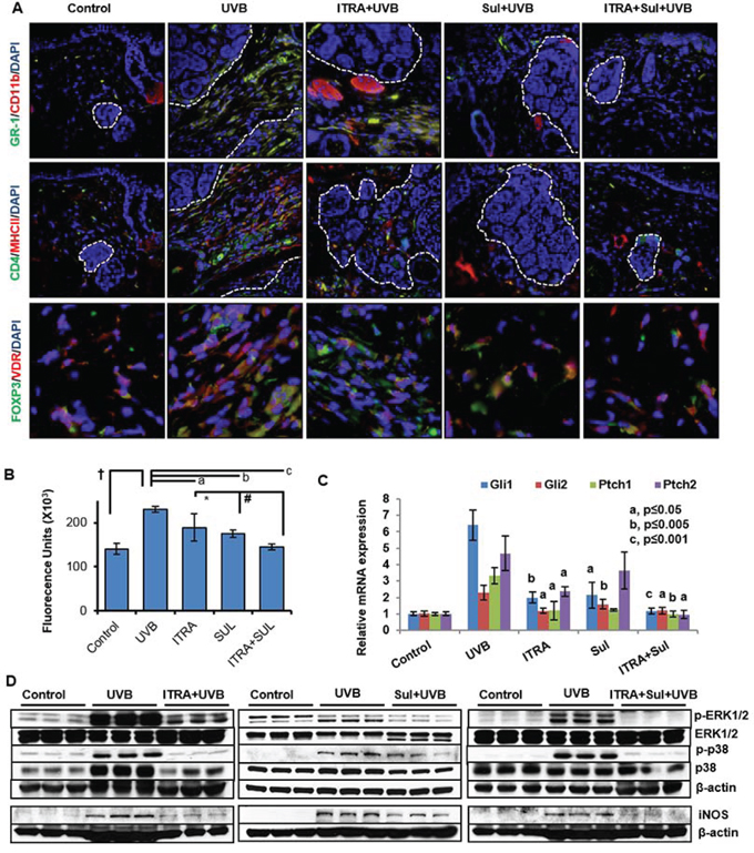 Figure 6: Combined administration of ITRA and Sul attenuates UVB-induced inflammatory responses in Ptch1+/−/SKH-1 mice. A. immunofluorescence staining showing presence of GR-1 (green)/CD11b (red)-positive myeloid cells (upper panel), CD4 (green)/MHC11 (red)-positive T helper cells (middle panel) and FOXP3 (green)/ VDR (red)-positive regulatory T cells (lower panel) in stroma of BCCs from UVB-irradiated age-matched control mice treated with ITRA and Sul alone and in combination. B. Cutaneous myeloperoxidase (MPO) activity in the skin from UVB-irradiated age-matched control mice and those treated with ITRA and Sul alone and in combination. † p = 0.0006; a p = 0.097; b p = 0.001; c p = 0.0002; *p = 0.118; #p = 0.02. C. Relative mRNA expression of Shh-signaling responsive genes. P value represents comparison of drug-treated vs UVB-irradiated mice. and D. Western blot analysis showing phosphorylation of ERK1/2 and p38 and expression of pro-inflammatory proteins iNOS in the skin from UVB-irradiated age-matched control, with ITRA and Sul alone and in combination treatment groups.
