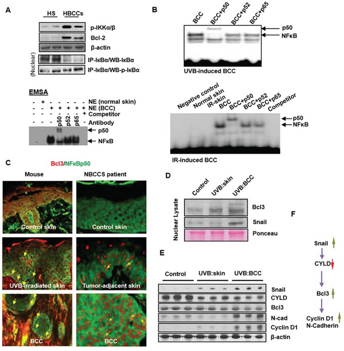 Figure 7: Activation of non-canonical NFκB signaling pathway in human and murine BCCs. A. Activation NFκB in human BCCs as shown by co-immunoprecipitation, EMSA and super-shift assays. B. EMSA/super-shift assays showing the activation of NFκB in UVB- and IR-induced murine BCCs. C. Co-expression of Bcl3 and p50 in mouse BCCs and in BCCs obtained from patients with NBCCS. Co-nuclear localization of Bcl3 and p50 proteins representing yellow nuclear staining (original magnification 40X). D. Western blot analysis showing expression of Bcl3 and Snail in nuclear lysates prepared from BCCs and tumor-adjacent skin; Expression of Bcl3 downstream transcription targets of Cyclin D1 and N-cadherin. E. Western blot showing expression of Snail, Cylindromatous (CYLD), Bcl3, N-cadherin and Cyclin D1 in whole cell lysates prepared from UVB-induced BCCs and tumor adjacent skin. F. Flow diagram showing regulation of Bcl3 and its downstream targets Cyclin D1 and N-cadherin.