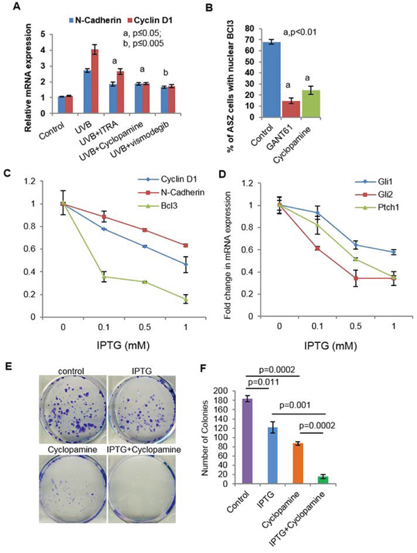 Figure 8: Crosstalk of Shh and Bcl3 signaling pathways in BCC cells regulate proliferation. A. mRNA expression of N-cadherin and cyclin D1 in skin of UVB-irradiated and Shh-inhibitors-treated. B. Percentage of ASZ001 cells showing nuclear localization of Bcl3 in GANT61 (10 μm) and Cyclopamine (5 μm)-treated cells. C. TaqMan real-time PCR showing effects of Isopropyl β-D-1-thiogalactopyranoside (IPTG) treatment on the expression of Bcl3, CyclinD1 and N-cadherin in ASZ001 cells. ASZ001 cells have been infected with IPTG-inducible Bcl3 shRNA lentiviral vector and were selected following treatment with puromycin containing growth medium. D. TaqMan real-time PCR showing the expression of shh signaling related genes Gli1, Gli2 and Ptch1 following knockdown of Bcl3 in ASZ001 cells. E. Colony formation assay in control, IPTG (1 mM), Cyclopamine (5 μm) and IPTG+Cyclopamine treated ASZ001 cells. F. Bar diagram showing colony numbers following various treatments.