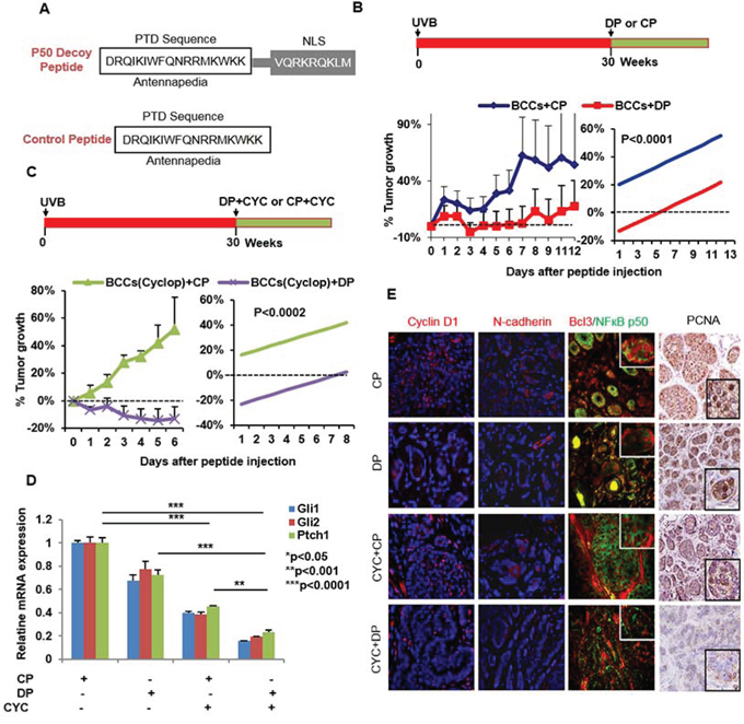Figure 10: Blocking NFκB with p50 decoy peptide (DP) reduces growth of BCCs in Ptch+/−/SKH-1 mice. A. Sequence of p50 DP and CP. B. Tumors treated with CP were unaffected and continue to grow whereas DP treatment was tumor growth static. C. Animals treated with the combination of cyclopamine and DP showed regression of tumors as compared to mice treated with cyclopamine+CP (p < 0.0002). D. Relative mRNA expression of Gli1/2 and Ptch1 in tumor lesions treated with CP, DP and/or Cyclopamine. E. Nuclear localization of Bcl3/p50 and for the levels of Cyclin D1/N-cadherin/PCNA (immuno-fluorescence and immunohistochemical staining). N-cadherin and cyclin D1 are known downstream transcriptional targets of Bcl3/p50. Treatment with DP blocked nuclear entry of Bcl3 (red)/p50 (green) and reduced Cyclin D1 and N-cadherin expression whereas treatment with CP failed to do so. Please note nuclear signal (yellow) for the co-localization of Bcl3/p50 in CP-treated control panel whereas DP-treated tumors show nuclear staining for these proteins. Simple linear regression for the analysis of the differences between the two treatment groups was used. The outcome is the averaged value of the tumor decrease percentage compared with day 0 for different tumors. We considered the treatment effect and the time variable as the covariates in our regression model and considered statistically significant with p-value = 0.0002 or less.