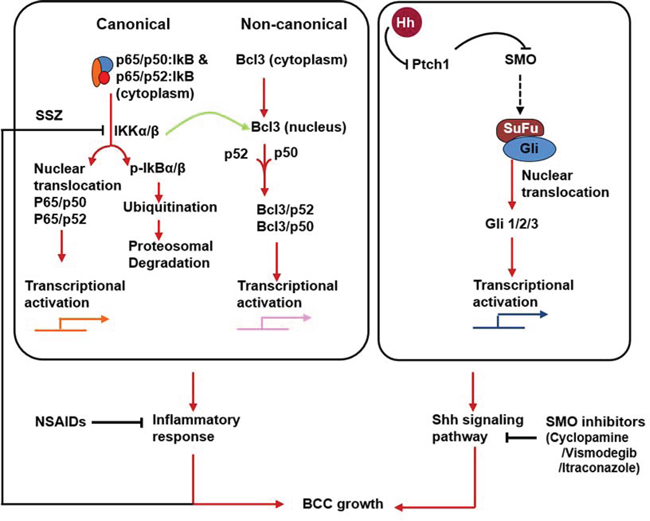 Figure 11: Flow diagram showing canonical and non-canonical NFκB pathways. Nuclear localization of p50 and Bcl3 complex and its transcriptional activation drives overexpression of downstream target genes such as Cyclin D1 and N-cadherin. Moreover, activation of both Shh and p50/Bcl3 signaling pathways in basal keratinocytes drive pathogenesis of BCCs in the murine model of NBCCS and in patients with NBCCS. Inhibition of these two pathways together abrogates BCC development in Ptch1+/-/SKH-1 mice.