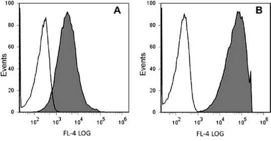 Figure 1: Sorting of the SKOV-kat cells based on Katushka fluorescence. A. Initial Katushka-positive SKOV-kat population (grey histogram) versus parental SKOV-3 cells (white histogram). B. Sorted SKOV-kat after three sort/expansion cycles (grey histogram) versus parental SKOV-3 cells (white histogram).