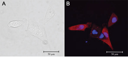 Figure 2: Visualization of SKOV-kat cells. A. SKOV-kat cells in transmitted light; B. Fluorescence of SKOV-kat cells expressing protein Katushka (red) visualized by confocal microscopy; nuclei are stained with Hoechst 33258 (blue).