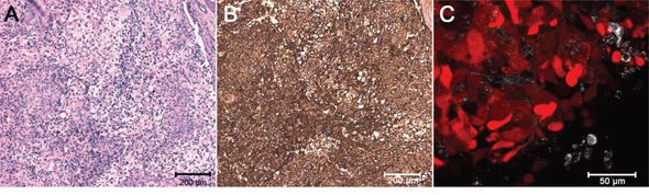 Figure 3: Characterization of tumor xenograft. A. Staining of a tumor tissue section with hematoxilin and eosin (H&E). B. Immunohistochemical staining of a tumor tissue section with HercepTest (Dako); strong brown coloring corresponds to HER2 overexpression. C. Confocal image of tumor tissue; red color, TurboFP635 fluorescence. The image acquisition parameters were the same as in experiments on cells (described in the Materials and Methods section).