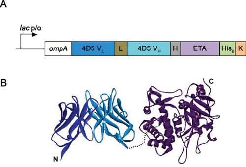 Figure 4: Design of recombinant immunotoxin 4D5scFv-ETA. A. Gene construct encoding immunotoxin 4D5scFv-ETA. OmpA, a signal peptide for directed secretion of the recombinant protein to the E. coli periplasm. 4D5 VL (blue), light chain of monoclonal antibody 4D5scFv; L (brown), designed linker (21 a.a.); 4D5 VH (turquoise), heavy chain of 4D5scFv monoclonal antibody; H (gray), hinge-like linker (16 a.a.); ETA (purple), 252–613 a.a. of the Pseudomonas exotoxin A; His6 (green), C-terminal cluster of 6 His residues (His6-tag); K (orange), KDEL sequence. The fusion gene is under control of the lac promoter. B. Molecular model (ribbon representation) of 4D5scFv-ETA created using DS Viewer Pro 5.0 software, based on the X-ray crystal structure of the wild-type ETA (Protein Data Bank code: 1IKQ) and 4D5scFv (Protein Data Bank code: 1FVC). Colors are as in Fig. 4A.
