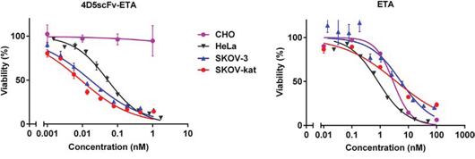 The cytotoxic effect of 4D5scFv-ETA was tested on a number of cell lines with different levels of the HER2 expression: cell lines SKOV-3 and SKOV-kat overexpressing HER2 [14]; HeLa cells with relatively low level of the HER2 expression [15], and HER2-negative CHO cells [16]. Besides, the effects of free 4D5scFv and ETA were evaluated separately to verify the efficacy of 4D5scFv-ETA as a fuse of targeting and cytotoxic modules.