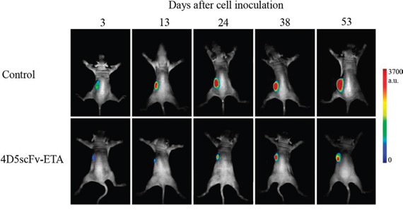 4D5scFv-ETA was injected into a mouse intraperitoneally in a single dose of 50 pmol per animal in 0.1 ml PBS 24 h after the inoculation of tumor cells. In the control group mice were injected with 0.1 ml PBS.