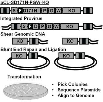 Figure 3: Shuttle vector rescue. Replication incompetent gammaretroviral vector pCL-SD171N-PGW3-KO. Genomic DNA containing vector provirus is sheared, forming genomic DNA fragments containing the R6Kγ origin of replication, kanamycin resistance gene (KO), and viral LTR B). Shuttle vector rescue of genomic plasmids grown in E. coli, picked, and sequenced for vector-chromosome junctions using a 3′ LTR specific primer. Sequences are trimmed removing the LTR and aligned to the human genome to identify integration sites.