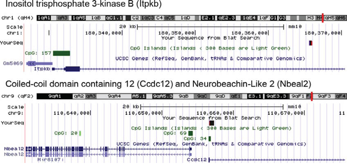 Figure 4: Vector-chromosome junctions. Vector-chromosome junctions were mapped to the mouse genome using the UCSC BLAT genome browser. The first identified integration occurred within the inositol triphosphate 3-Kinase B (Itpkb) gene. The second integration occurred within a CpG island between gene regions for Coiled-coil domain containing 12 (Ccdc12) and Neurobeachin-like2 (Nbeal2).