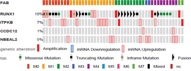 Figure 5: Genetic alterations of identified genes in human AML by FAB. Identified genes were analyzed using cBioPortal on 166 fully annotated patients from the 2013 TCGA human AML data set. The percentage of total altered cases in the data set is listed, and only cases with genetic alterations are shown. Cases are sorted by the French, American, and British (FAB) subtype.