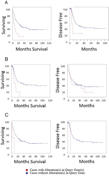 Figure 6: Overall survival and disease free survival analysis of ITPKB, NBEAL2 and CCDC12 in AML. Left panels are overall survival and right panels are disease free survival after initial treatment A. ITPKB. Overall survival time for patients that do not harbor alterations in ITPKB is significantly longer than patients with alterations in ITPKB (log rank test P-Value: 5.5 × 10−4) (Cases with alteration in query gene: total cases: 12, deceased: 5, median months survival: 5.2, cases without alteration in query gene: total cases: 154, deceased: 98, median months survival: 20.5). Patients with ITPKB alterations had significantly lower disease free survival (log rank test P-Value: 0.01) (Cases with alteration in query gene: total cases: 12, deceased 5 median months survival 5.2, Cases without alteration in query gene: total cases: 152, deceased: 72, median months survival: 17). B. NBEAL2. The overall survival time for patients that do not harbor alteration in NBEAL2 is significantly longer than patients with alterations in NBEAL2 (log rank test P-Value: 0.004) (Cases with alteration in query gene: total cases: 8, deceased: 11, median months survival 11.8, cases without alteration in query gene: total cases: 154, deceased: 98, median months survival: 18.5). Effect of NBEAL2 alteration on disease free survival after initial treatment. Disease free survival was not significantly different for patients with or without NBEAL2 alterations (log rank test P-Value: 0.53) (Cases with alteration in query gene: total cases: 2, deceased: 1, median months survival: 8.2, cases without alteration in query gene: total cases: 162, deceased: 76, median months survival: 17). C. CCDC12. The overall survival time for patients that do not harbor alteration in CCDC12 is significantly longer than patients with alterations in CCDC12 (log rank test P-Value: 0.03) although there were few patients harboring this mutation in the 2013 TCGA cohort (Cases with alteration in query gene: total cases: 2, deceased: 2 median months survival: 0.8, cases without alteration in query gene: total cases: 164, deceased: 107, median months survival: 18.5). The disease free survival was not significantly different for patients with or without CCDC12 alterations (log rank test P-Value: 0.18) (Cases with alteration in query gene: total cases: 2, deceased: 1, median months survival: 8.2, cases without alteration in query gene: total cases: 162, deceased: 76, median months survival: 17).