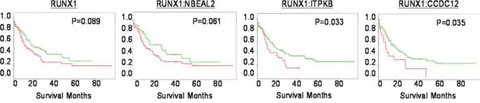 Mutations were analyzed for mutual exclusivity, with a trend of co-occurrence between RUNX1 and ITPKB alterations (Sup. Table 2). Using SurvExpress, an online biomarker validation tool and database for cancer gene expression on the 2013 TCGA AML leukemia data set, we observed significant differential expression of all genes identified using our approach in high and low risk AML (Sup. Fig. 1).