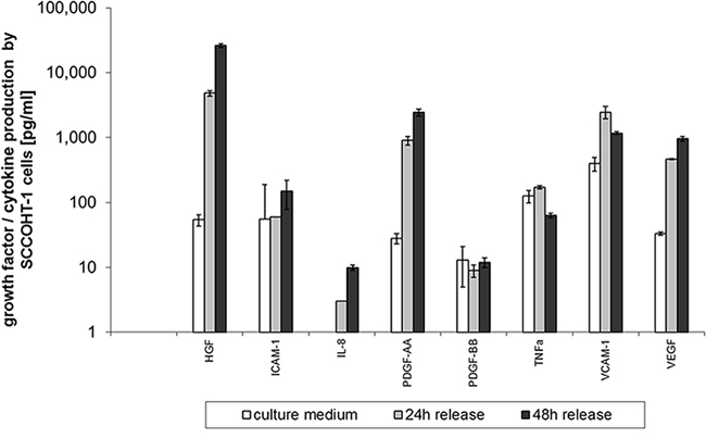 Figure 1: Quantitative production of distinct growth factors and cytokines was measured in supernatants of SCCOHT-1 (2 × 105 cells/ml) after 24 h and 48 h, respectively, using a multiplexed human chemokine assay system. Data represent the amount of cytokine/growth factor production [pg/2 × 105 cells] ± s.d. (n = 4). (HGF = hepatocyte growth/scatter factor; ICAM-1 = intercellular cell adhesion molecule-1; IL-8 = interleukin-8; PDGF = platelet-derived growth factor; TNFa = tumor necrosis factor-alpha; VCAM-1 = vascular cell adhesion molecule-1; VEGF = vascular endothelial growth factor)