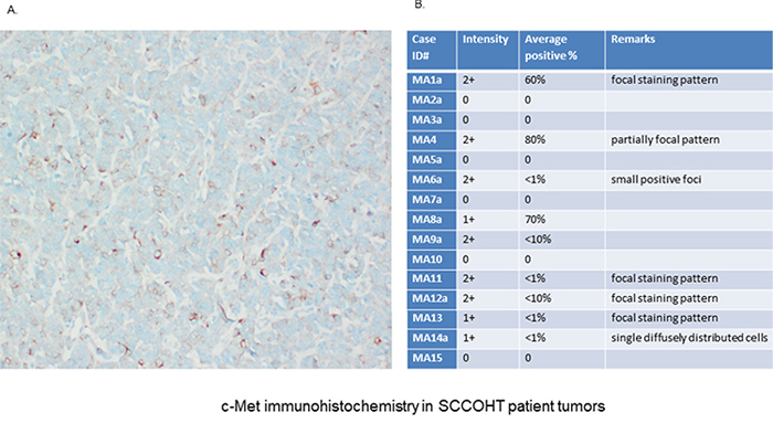 Figure 3: Immunhistochemical (IHC) detection of c-Met was performed in specimen of 16 different patients with confirmed SCCOHT. A. IHC analysis in the primary patient tumor (origin of SCCOHT-1 cells) confirmed c-Met expression at variable levels with predominantly membrane-bound staining. B. An additional pilot series (n = 15) of primary SCCOHT showed microscopically detectable c-Met expression together with the SCCOHT-1 originating tumor predominantly in 6/16 cases. The staining confirmed significant c-Met expression in a subset of SCCOHT and showed striking variability across cases and within individual tumors, suggesting intra- and intertumoral heterogeneity of c-Met expression.