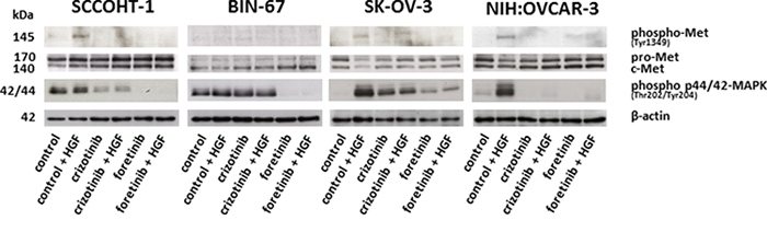 Figure 4: Western blot analysis was performed for c-Met phosphorylation at Tyr1349 and p44/p42 MAP kinase phosphorylation at Thre202/Tyr204 in SCCOHT-1, BIN-67, NIH:OVCAR-3 and SK-OV-3 ovarian cancer cells following 30 min of HGF stimulation in the presence or absence of the c-Met inhibitors crizotinib or foretinib, respectively.