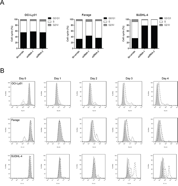 Figure 4: CD300A knockdown decreased the rate of DLBCL cell division. A. Cell cycle distribution of OCI-Ly01, Farage, and SUDHL-4 cells with or without CD300A knockdown was assessed by measuring DNA content of PI-stained cells using flow cytometry. B. The cell division was measured using CFSE labeling method. Following CFSE incorporation into the cells, the dilution of fluorescence intensity was determined every 24 h using flow cytometry.