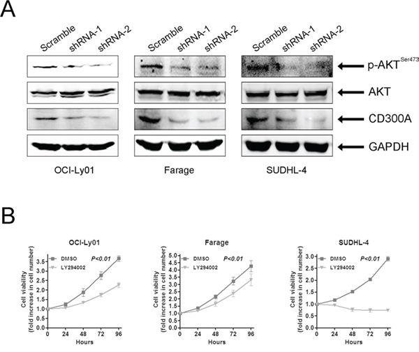 Figure 5: CD300A knockdown suppressed AKT phosphorylation in DLBCL cells. A. Whole cell lysates obtained from OCI-Ly01, Farage, and SUDHL-4 cells with or without CD300A knockdown were analyzed using western blotting with antibodies specific for phospho-AKT (SER473), total AKT, CD300A, and GAPDH. B. Cell proliferation assay of OCI-Ly01, Farage, and SUDHL-4 cells treated with LY294002 (5 μM). The fold increase in cell number indicates OD values relative to those at time 0. Data were represented as mean ± SEM from at least three independent experiments.