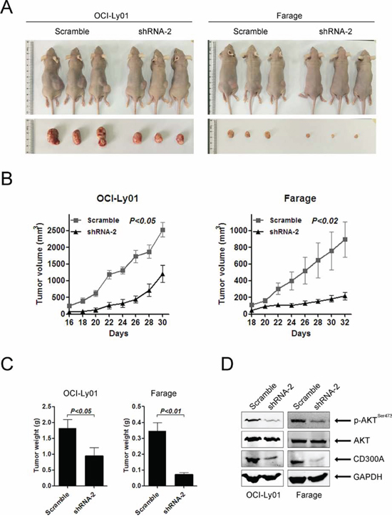 Figure 6: Loss of CD300A suppressed DLBCL tumor growth in vivo. A. Representative photographs of mice 30–32 days after separately injected in the flank with OCI-Ly01 and Farage cells with or without CD300A knockdown (n = 5 for each group). B. The increase in tumor volumes in mice received OCI-Ly01 and Farage cells with or without CD300A knockdown. Tumor volumes were measured every two days. C. The tumor weights of mice received OCI-Ly01 and Farage cells with or without CD300A knockdown. The tumors were weighted on day 30–32 when all animals were sacrificed. Data were represented as mean ± SEM from five mice in each group. D. The decreased levels of p-AKT in tumors received OCI-Ly01 and Farage cells with CD300A knockdown in comparison to those received control cells. The levels of specific proteins were analyzed using western blotting.