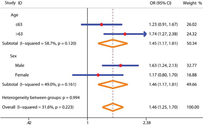 Figure 1: Subgroup analysis of demographic features for the association between SNP rs4759314 and gastric cancer risk in genetic dominant model. The red diamonds and blue horizontal lines correspond to the subgroup-specific OR and 95% CI; the orange diamonds represents the pooled OR with 95% CI.