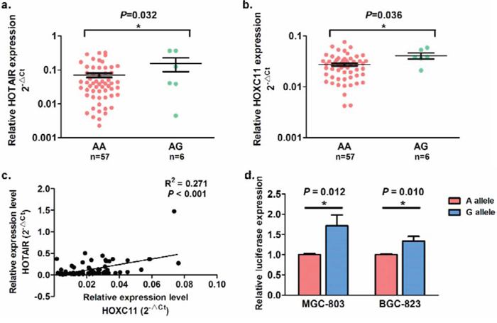 Figure 2: The allele-specific effects of SNP rs4759314 on HOTAIR and HOXC11 expression in 63 gastric cancer tissues and allele-specific promoter activity. The allele-specific effects showed significantly on HOTAIR a. and HOXC11 b. The expression of HOTAIR and HOXC11 presented a slight correlation in gastric cancer tissues c. expression level, as well on the intronic promoter activity d.