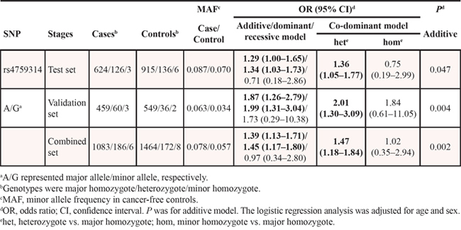 Table 1: The association between SNP rs4759314 of HOTAIR and gastric cancer susceptibility in two-stage case-control study