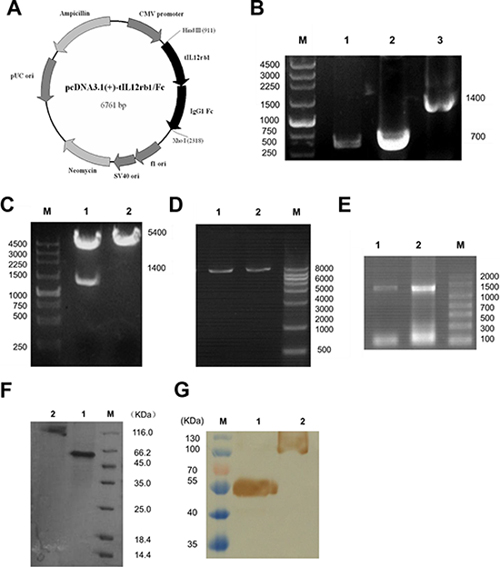 Figure 1: Construction, expression, and purification of tIL12rβ1/Fc. A. Plasmid map of the eukaryotic expression plasmid containing human truncated IL-12rβ1 receptor (pcDNA3.1(+)-tIL12rβ1/Fc). The gene sequence encoding tIL12rβ1/Fc was inserted into pcDNA3.1(+) vector at the corresponding restriction sites Hind III and Xho I. B. PCR products of tIL12rβ1/Fc recombinant gene. Lane 1, tIL12rβ1/Fc gene sequence containing the signal peptide. Lane 2, IgG1 Fc fragment. Lane 3, recombinant tIL12rβ1/Fc fused gene product using overlap PCR. M, DNA molecular weight markers, bp. C. Correctly constructed plasmid was verified by digestion at the Hind III and Xho I sites. Lane 1, pcDNA3.1(+)-tIL12rβ1/Fc after digestion. Lane 2, pcDNA3.1(+) -tIL12rβ1/Fc before digestion. M, DNA molecular weight markers, bp. D. Plasmids were linearized for cell transfection using Pvu I. Lane 1 and 2, linearized pcDNA3.1(+)-tIL12rβ1/Fc. M, DNA molecular weight markers, bp. E. Total RNA of the two strains were identified by RT-PCR with primers F1 and F4. F. SDS-PAGE analysis of the purified tIL12rβ1/Fc fusion protein using Protein A column. Lane 1, purified tIL12rβ1/Fc fusion protein at reduced state. Lane 2, purified tIL12rβ1/Fc fusion protein at non-reduced state. M, protein molecular weight markers, KDa. G. Western blot analysis of tIL12rβ1/Fc using mAbs against human IL12rβ1. Lane 1, purified tIL12rβ1/Fc fusion protein at reduced state. Lane 2, purified tIL12rβ1/Fc fusion protein at non-reduced state. M, protein molecular weight markers, KDa.