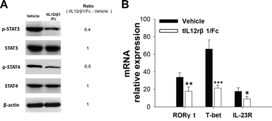 Figure 8: The inhibitory effect of tIL12rβ1/Fc on Th1 and Th17 in relation to STAT signaling pathway. A. Purified CD4+ splenocytes from tIL12rβ1/Fc-treated mice or control EAE mice on day 18 post-immunization (therapeutic protocol) were analyzed by Western blot assay for the expression or phosphorylation of indicated proteins in the STAT pathway. B. The same CD4+ T cell preparations were measured for the mRNA abundance of RORγt, T-bet and IL-23R by quantitative real-time RT-PCR. Data are representative of three independent experiments. *p < 0.05; **p < 0.01; ***p < 0.001.