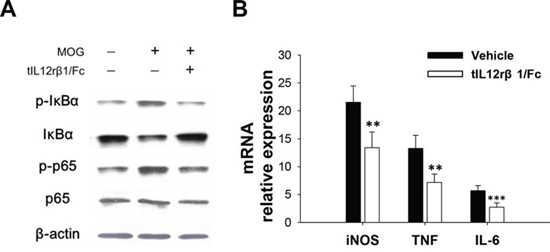Figure 9: Inhibition of NF-κB signaling pathway by tIL12rβ1/Fc treatment. A. Splenocytes from tIL12rβ1/Fc or vehicle-treated EAE mice on day 18 post-immunization (therapeutic protocol) were analyzed for phosphorylated IκBα, phosphorylated p65, IκBα and p65 by Western blot assay. B. Expression levels of NF-κB-regulated gene products including IL-6, TNF-α and iNOS were measured by quantitative real-time RT-PCR. Data are representative of three independent experiments. **p < 0.01; ***p < 0.001.