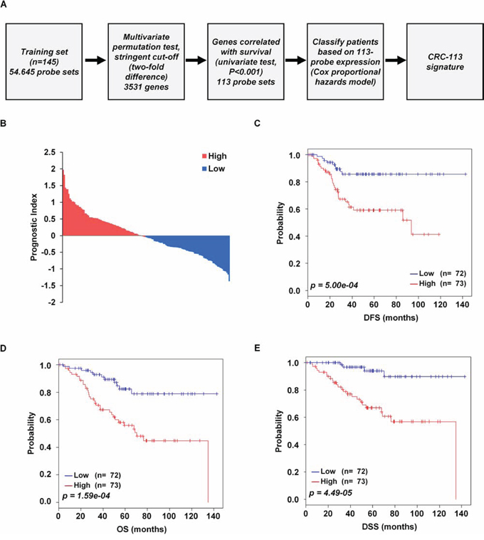 Figure 1: Survival analysis of the discovery data set. A. Schematic overview of the procedure used to construct CRC-113 gene signature based on gene expression data. B. The relative prognostic index based on CRC-113 gene signature expression of each patient. The weight of each gene was calculated by the Cox proportional hazard regression model. C–E. Kaplan-Meier plots for DFS, OS, and DSS of two risk groups in the discovery data set. p values were computed by log-rank test.