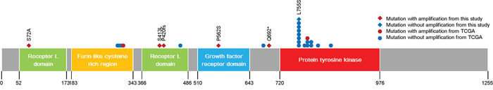 To evaluate the role of HER2 mutations in HER2-positive refractory MBC, clinical outcomes and the disease course of the five HER2-positive patients with HER2 mutations were investigated. As shown in Figures 1 and 2 and Table 2, these five patients had HER2-positive BC with HER2 amplification as well as HER2 mutations. However, these mutations did not involve the same site: three were missense and two were truncation mutations, and there was no mutation in the PTKD (Figure 3). Interestingly, no patient was both ER-positive and HER2-positive. All five patients with HER2 mutations in the HER2-amplified BC were HR-negative. Most importantly, four of the five patients did not show any durable clinical response to trastuzumab- and/or lapatinib-containing chemotherapies for more than 12 months (Table 4). They were HER2-positive patients with MBC whose disease was refractory to targeted therapies including trastuzumab-DM1.