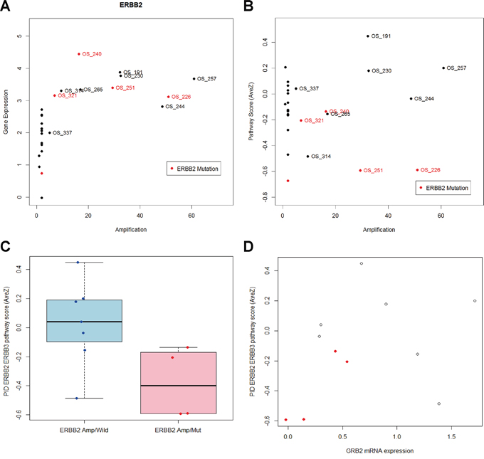 Figure 5: HER2 pathway analysis. A. ERBB2 copy number and gene expression of twenty seven metastatic breast cancer patients. ERBB2 gene expression is significantly higher in patients with increased copy number. Patients with ERBB2 mutation is red colored. B. Averaged mRNA expression of genes in the PID ERBB2 ERBB3 pathway is not associated with ERBB2 amplification. C. Among eleven patients with ERBB2 amplification, pathway score is significantly different between patients with ERBB2 mutation and patients without ERBB2 mutation (P-value = 0.0413). D. ERBB2 amplified and mutated samples yield less expression of GRB2 and pathway level gene expression than ERBB2 amplified and wild.