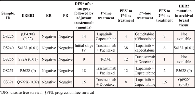 Table 4: HER2 mutation status of five HER2-positive MBC patients
