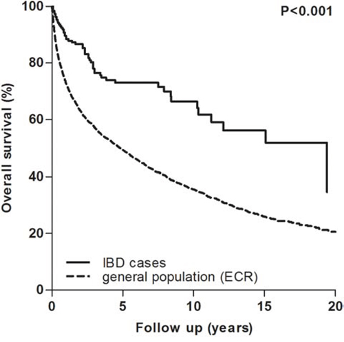 Figure 2: Overall survival curves of the general and IBD population following RCC diagnosis. IBD, inflammatory bowel disease; ECR, Eindhoven cancer registry