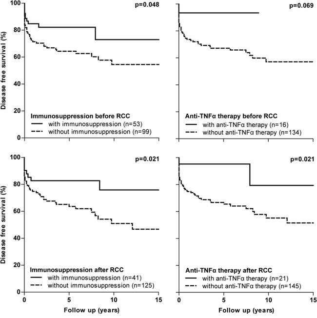 Based on received IBD medication, we performed subgroup survival analysis for IBD cases with RCC. Patients who used immunosuppression (including thiopurines, methotrexate and cyclosporine) and/or anti-TNFα therapy before or after RCC diagnosis had a statistically significantly better disease free survival following RCC diagnosis compared to those who did not (Figure 3). Especially patients who were treated with immunosuppression and/or anti-TNFα agents after RCC diagnosis, showed a better disease free survival. However, a multivariable Cox analyses adjusted for the confounders TNM stage and age at RCC diagnosis, abolished this protective effect of immunosuppressive and anti-TNFα therapy (immunosuppression before RCC diagnosis, p = 0.946; immunosuppression after RCC diagnosis, p = 0.386; anti-TNFα therapy before RCC diagnosis, p = 0.673; anti-TNFα therapy after RCC diagnosis, p = 0.502). Similar survival curves were found for the effect of IBD therapy on overall survival (data not shown).